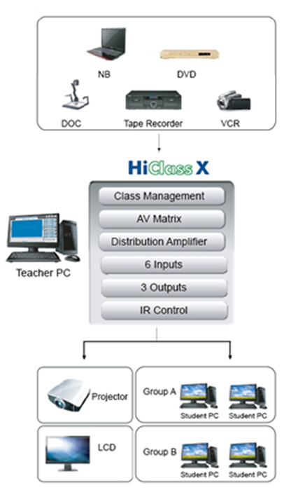 IK-298: Hiclass X Smart AV Matrix Kết nối với đầu DVD, máy chiếu, camera giáo viên và các thiết bị AV khác được sử dụng trong lớp học. |