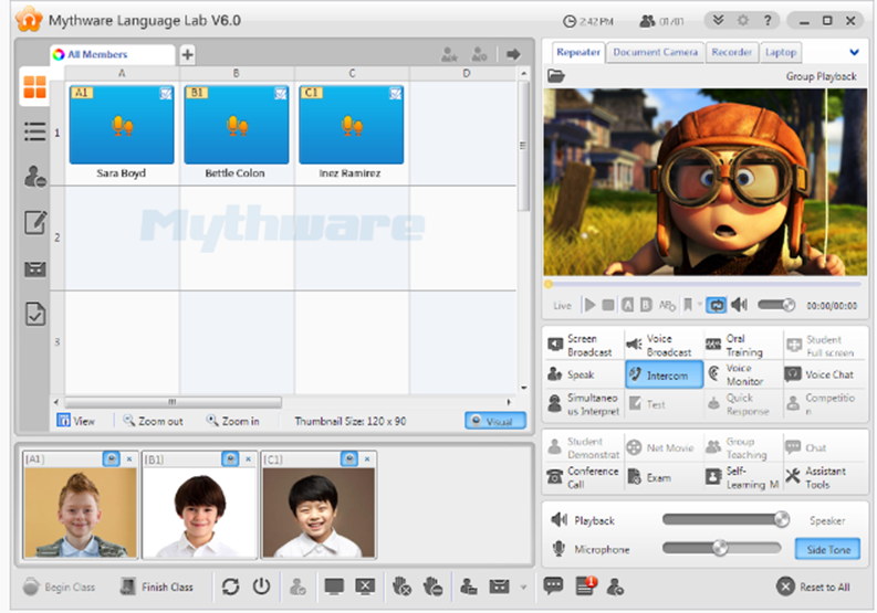 Phần mềm Lab dạy ngoại ngữ Mythware giúp cho giáo viên quản lý lớp học dễ dàng hơn nhiều. Giáo viên có thể theo dõi các màn hình sinh viên và tiếng nói trong thời gian thực, quyết định loại các trang web và các ứng dụng mà học viên có thể truy cập, cung cấp trợ giúp cho các học viên có thể có một số rắc rối trong lớp học.